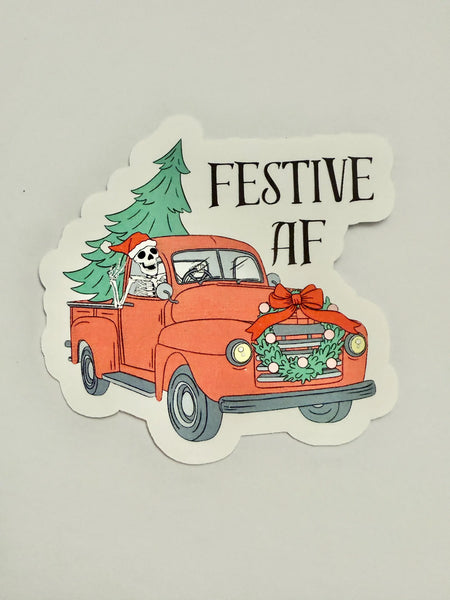 Add some spooky-season-meets-holiday-season flair with this “Festive AF” sticker featuring a joyful skeleton riding in a classic red Christmas pickup truck, tree in tow. Equal parts cozy, cute, and chaotic, this design is perfect for anyone who loves mixing goth vibes with holiday cheer.