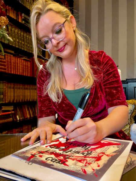 The original painting shown in the pictures is on canvas and uses sheet music, vintage book pages, acrylic paints, and black sharpie. Please message the shop for availability of the original painting. Prints are packaged in clear sealed wrapping against a hard black card stock with a small artist biography card. Each art piece is personally printed by Elexa on 32 lbs laser print paper and handcut to 8x10 inches for easy matting and framing.
