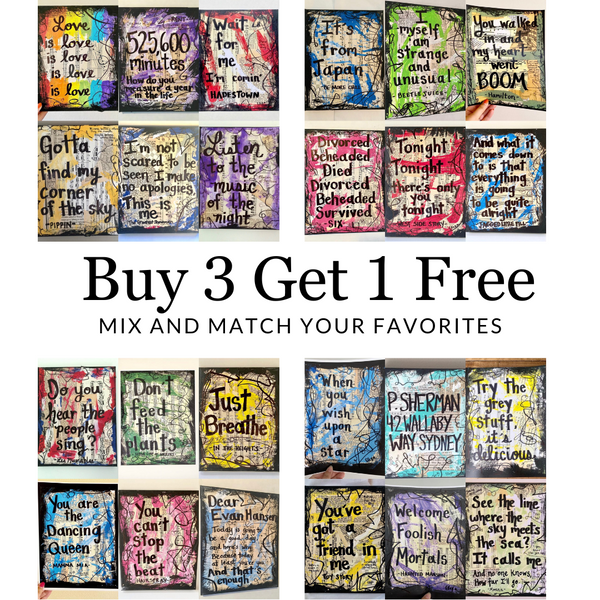 Pick 4 prints and get them for the price of 3, mix and match sizes and color series: https://lexicon-of-love.myshopify.com/products/sale-wall-art-broadway-musical-theatre-gifts-for-her-birthday-anniversary-gift-home-decor-disney-quote-movie-unique-gifts-art-prints